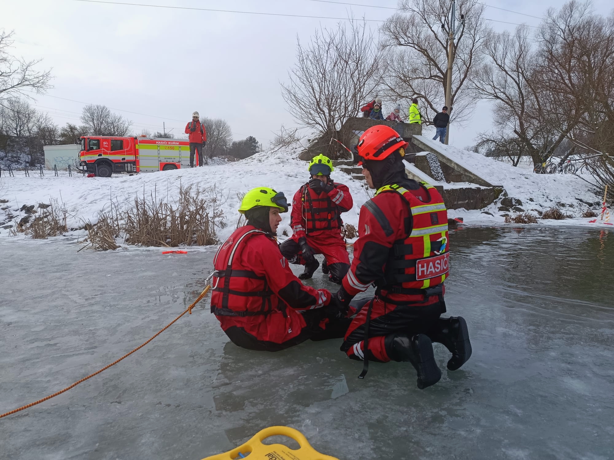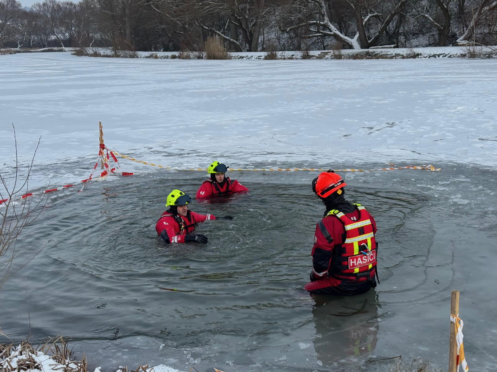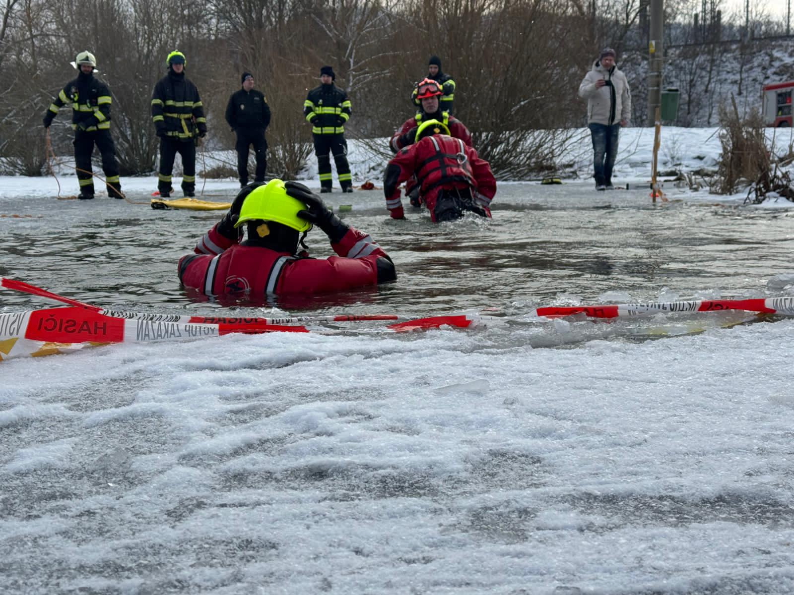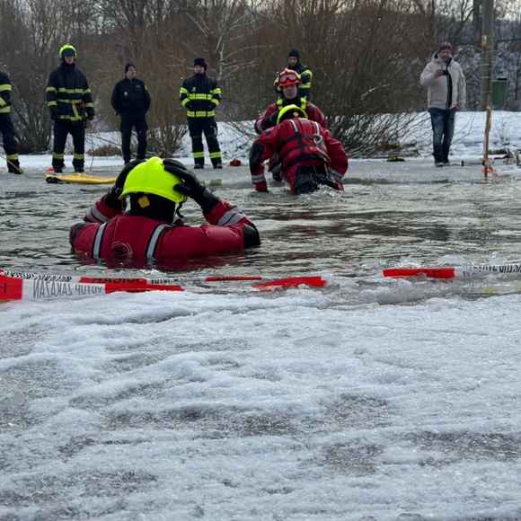 Výcvik začal dopoledne na hasičské zbrojnici v Kuřimi. Zde jsme se zaměřili na teorii – od bezpečnostních zásad při pohybu na zamrzlé hladině až po seznámení s technickými prostředky pro práci ve vodě.