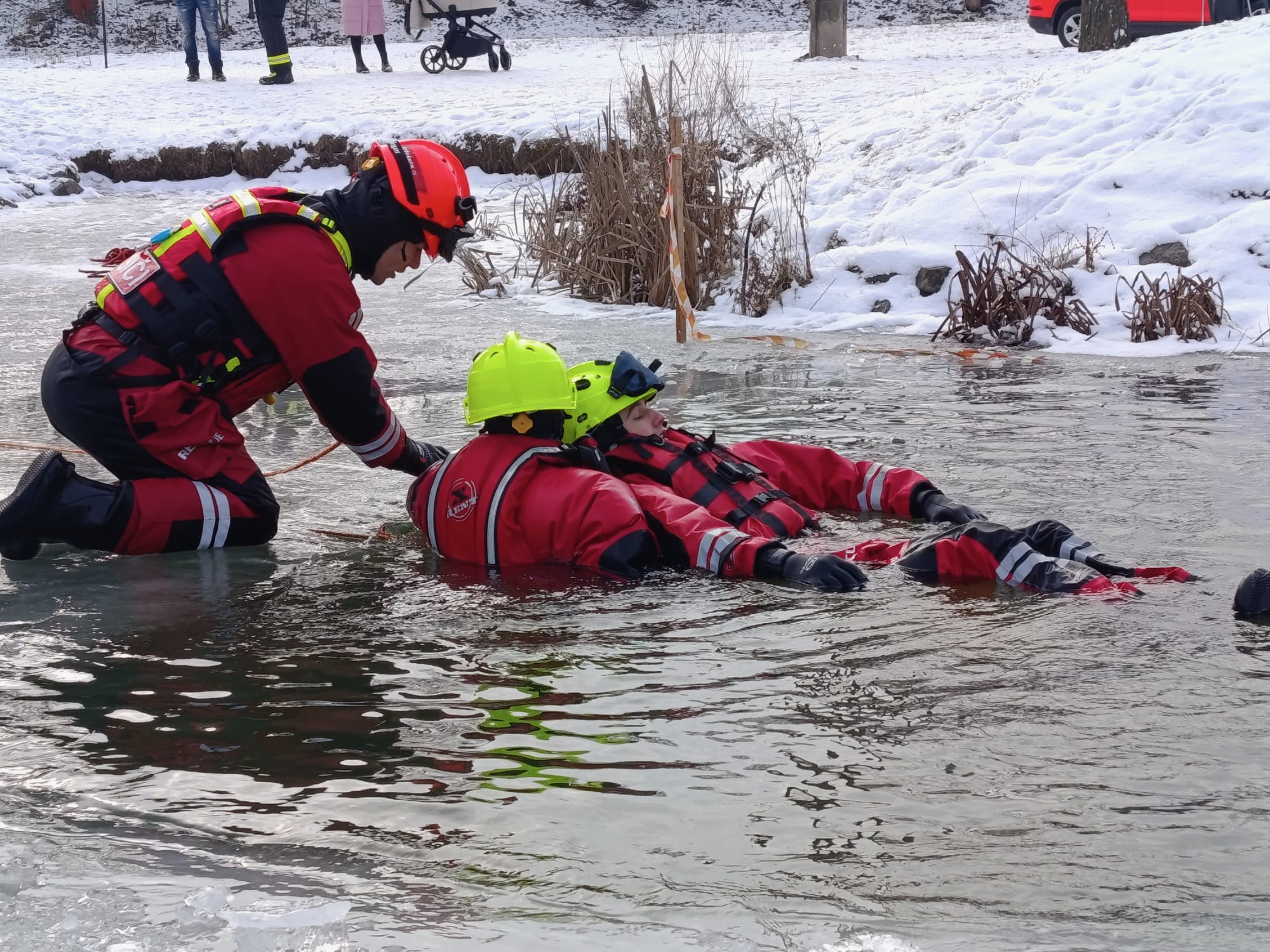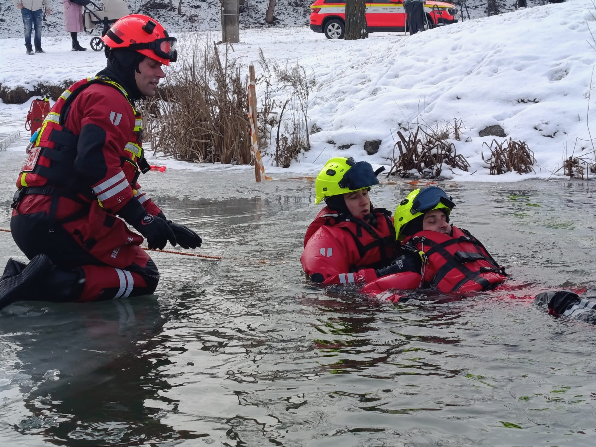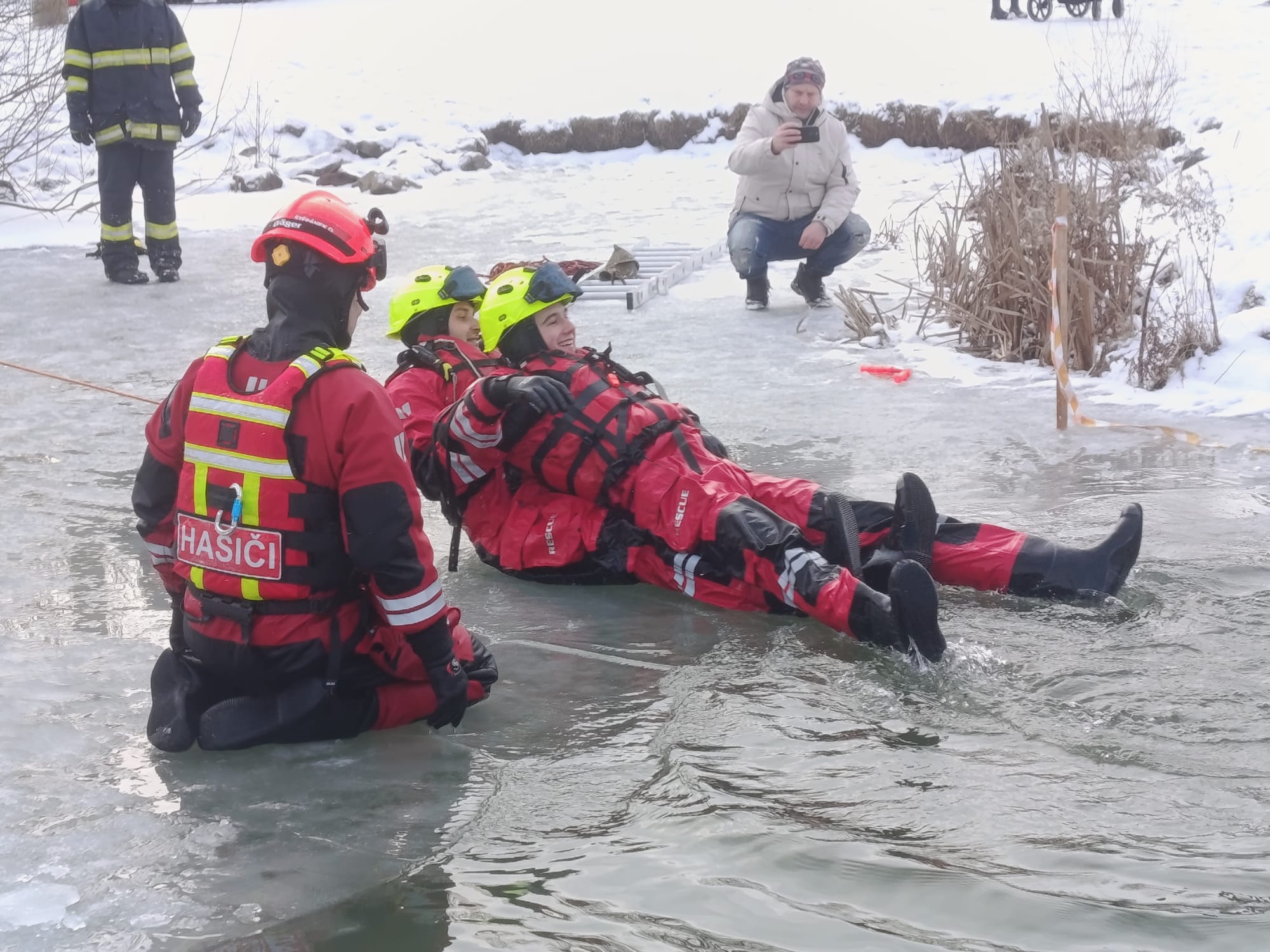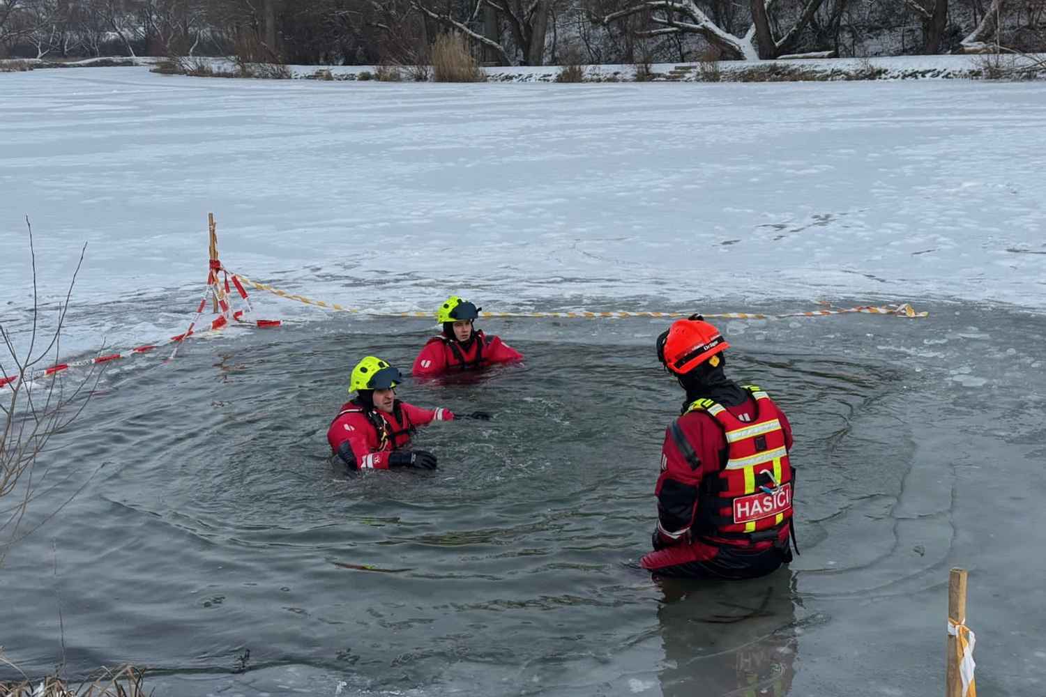 Výcvik začal dopoledne na hasičské zbrojnici v Kuřimi. Zde jsme se zaměřili na teorii – od bezpečnostních zásad při pohybu na zamrzlé hladině až po seznámení s technickými prostředky pro práci ve vodě.